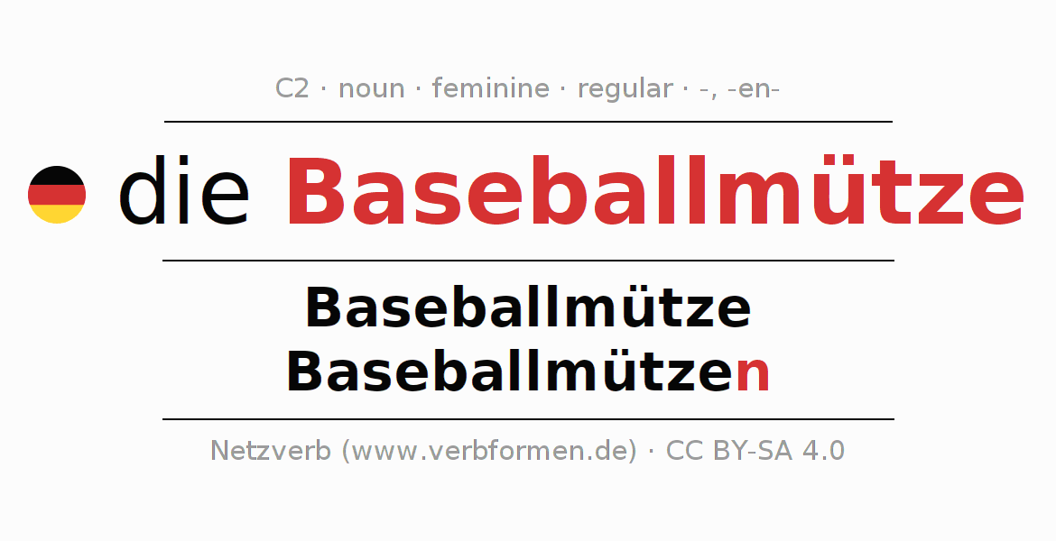 - Singular: die Baseballmütze, der Baseballmütze, der Baseballmütze, die Baseballmütze