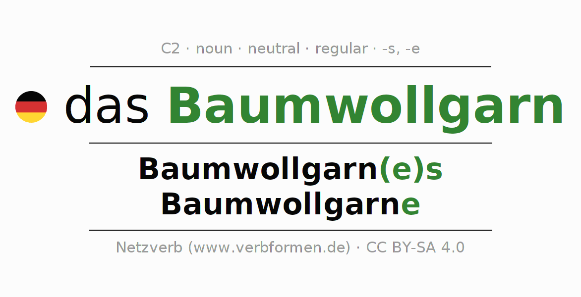 - Singular: das Baumwollgarn, des Baumwollgarn(e)s, dem Baumwollgarn(e), das Baumwollgarn