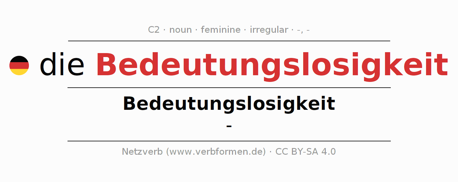The declension of Bedeutungslosigkeit as a table with all forms in singular (singular) and plural (plural) and in all four cases nominative (1st case), genitive (2nd case), dative (3rd case) and accusative (4th case). Especially for German learners the correct declension of the word Bedeutungslosigkeit is crucial.