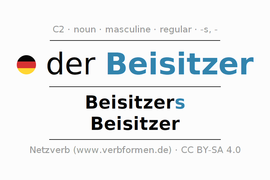 The declension of Beisitzer as a table with all forms in singular (singular) and plural (plural) and in all four cases nominative (1st case), genitive (2nd case), dative (3rd case) and accusative (4th case). Especially for German learners the correct declension of the word Beisitzer is crucial.