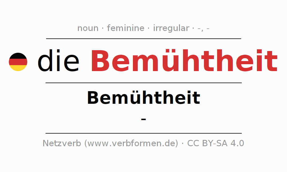 The declension of Bemühtheit as a table with all forms in singular (singular) and plural (plural) and in all four cases nominative (1st case), genitive (2nd case), dative (3rd case) and accusative (4th case). Especially for German learners the correct declension of the word Bemühtheit is crucial.