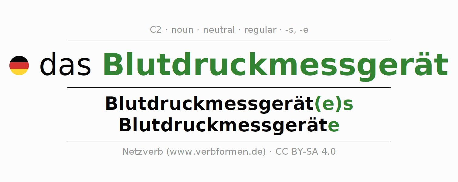 The declension of Blutdruckmessgerät as a table with all forms in singular (singular) and plural (plural) and in all four cases nominative (1st case), genitive (2nd case), dative (3rd case) and accusative (4th case). Especially for German learners the correct declension of the word Blutdruckmessgerät is crucial.