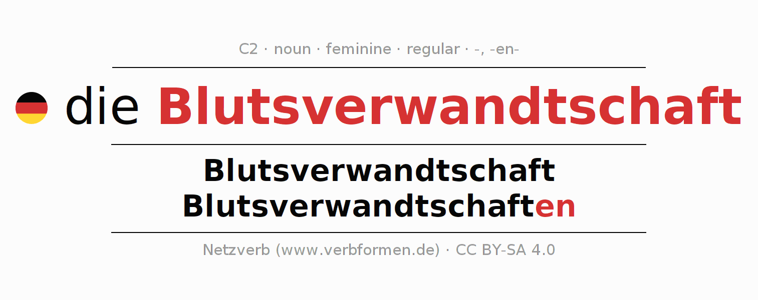 The declension of Blutsverwandtschaft as a table with all forms in singular (singular) and plural (plural) and in all four cases nominative (1st case), genitive (2nd case), dative (3rd case) and accusative (4th case). Especially for German learners the correct declension of the word Blutsverwandtschaft is crucial.