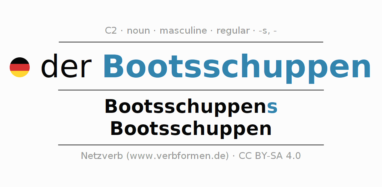 - Singular: der Bootsschuppen, des Bootsschuppens, dem Bootsschuppen, den Bootsschuppen