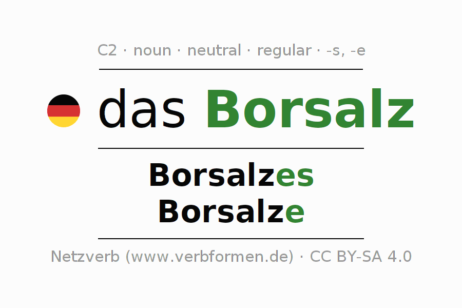 - Singular: das Borsalz, des Borsalzes, dem Borsalz(e), das Borsalz