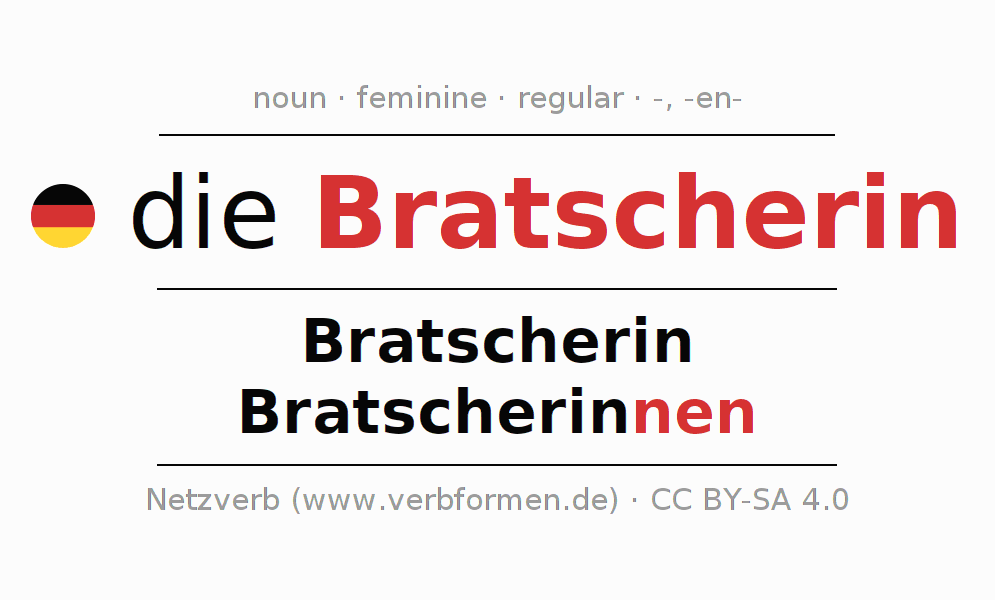 The declension of the noun Bratscherin (female violist) is in singular genitive Bratscherin and in the plural nominative Bratscherinnen. The noun Bratscherin is declined with the declension endings -/nen. The voice of Bratscherin is feminine and the article "die". Here you can not only inflect Bratscherin but also all German nouns. Comments ☆
