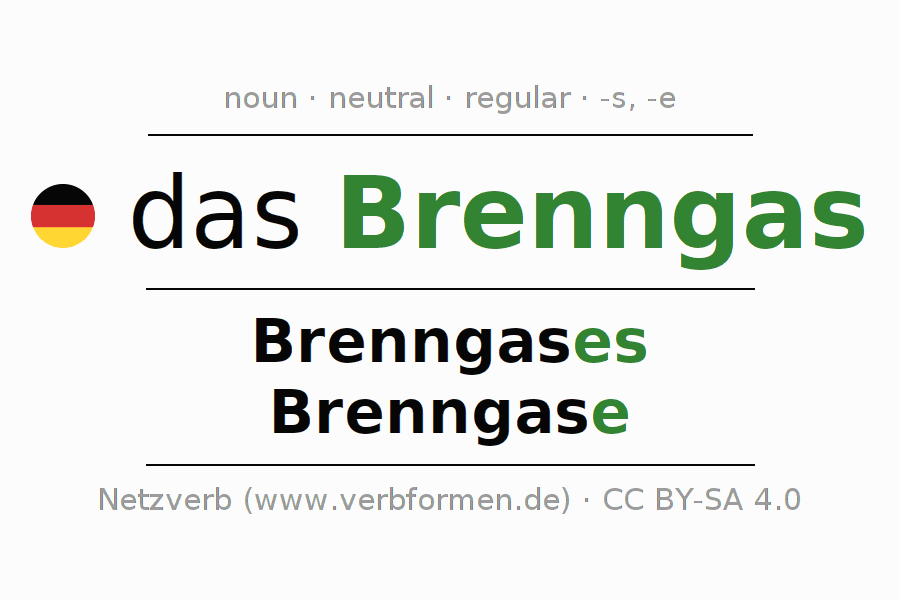 - Singular: das Brenngas, des Brenngases, dem Brenngas(e), das Brenngas