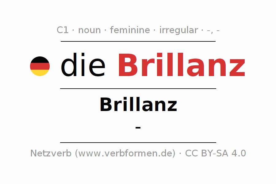The declension of Brillanz as a table with all forms in singular (singular) and plural (plural) and in all four cases nominative (1st case), genitive (2nd case), dative (3rd case) and accusative (4th case). Especially for German learners the correct declension of the word Brillanz is crucial.
