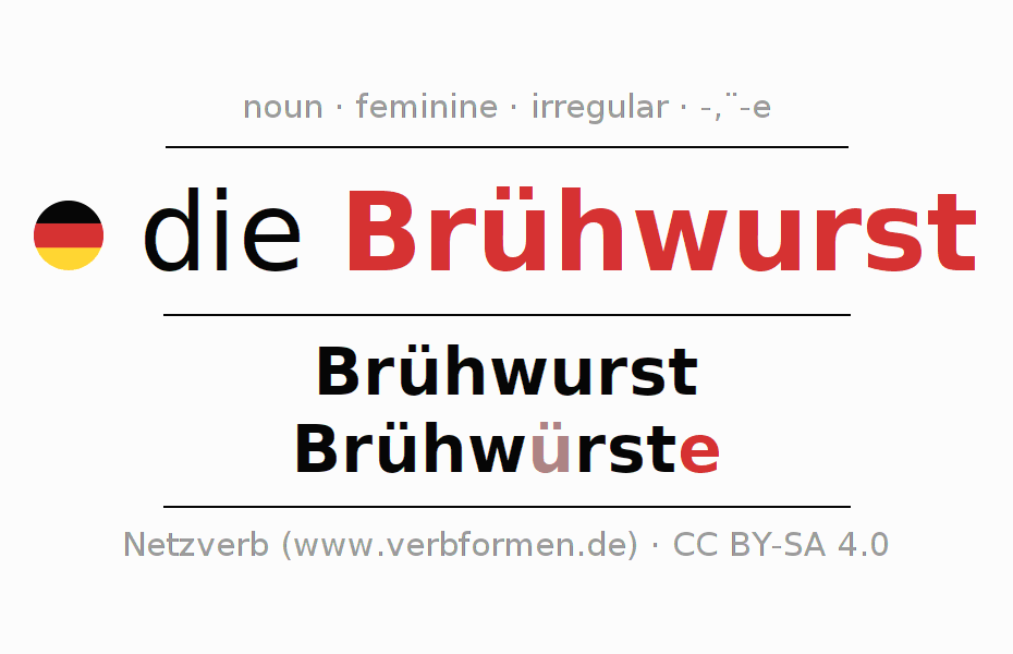 The declension of Brühwurst as a table with all forms in singular (singular) and plural (plural) and in all four cases nominative (1st case), genitive (2nd case), dative (3rd case) and accusative (4th case). Especially for German learners the correct declension of the word Brühwurst is crucial.