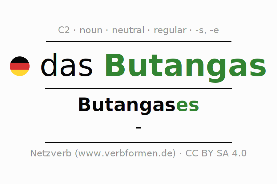- Singular: das Butangas, des Butangases, dem Butangas(e), das Butangas