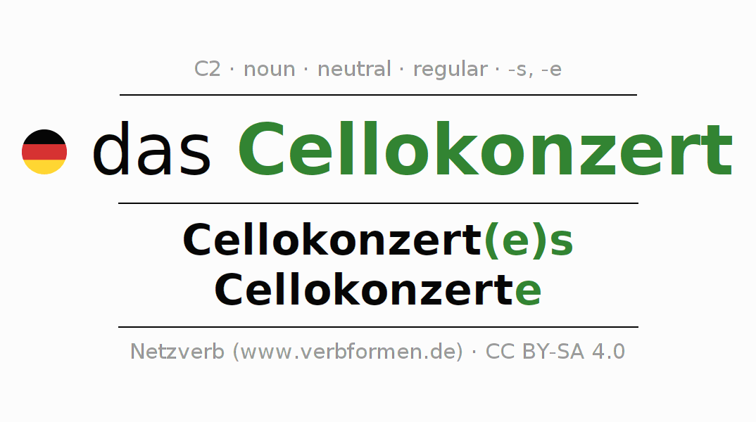 - Plural: die Cellokonzerte, der Cellokonzerte, den Cellokonzerten, die Cellokonzerte