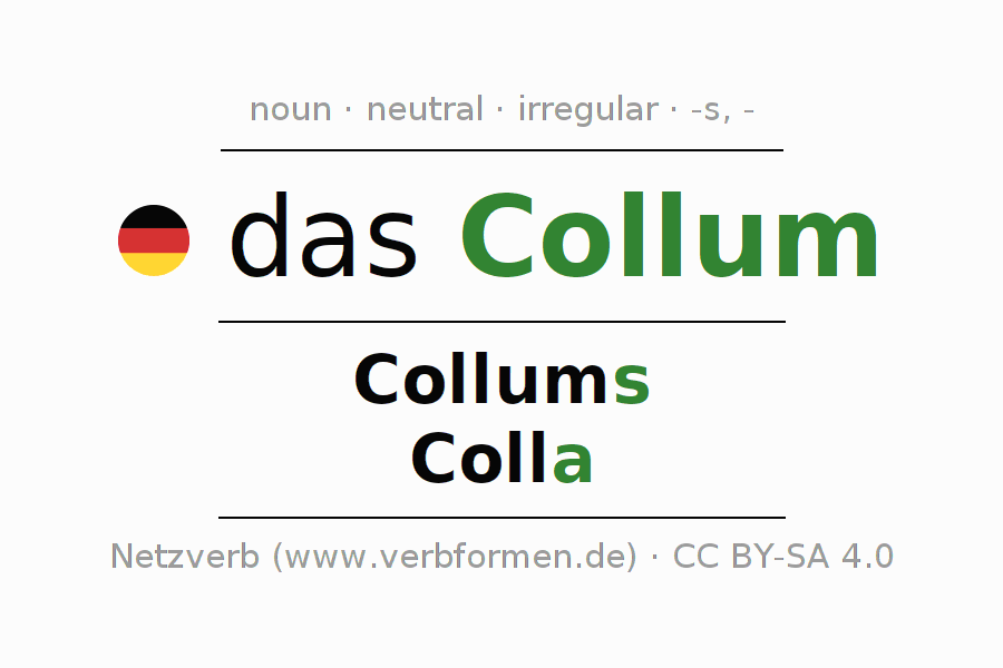 The declension of the noun Collum (neck) is in singular genitive Collums and in the plural nominative Colla. The noun Collum is declined with the declension endings s/a. The voice of Collum is neutral and the article "das". Here you can not only inflect Collum but also all German nouns. Comments ☆