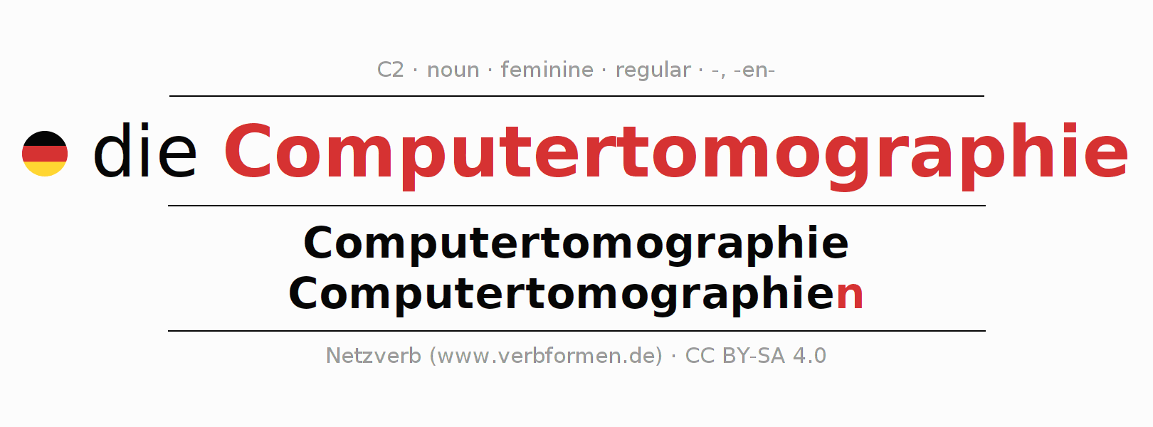 - Singular: die Computertomographie, der Computertomographie, der Computertomographie, die Computertomographie