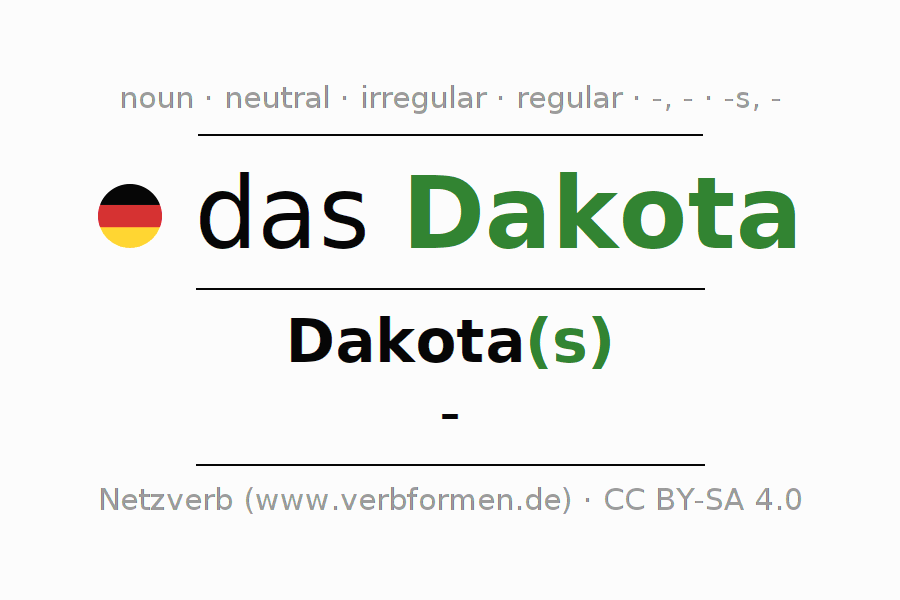 The declension of das Dakota as a table with all forms in singular (singular) and plural (plural) and in all four cases nominative (1st case), genitive (2nd case), dative (3rd case) and accusative (4th case). Especially for German learners the correct declension of the word das Dakota is crucial.