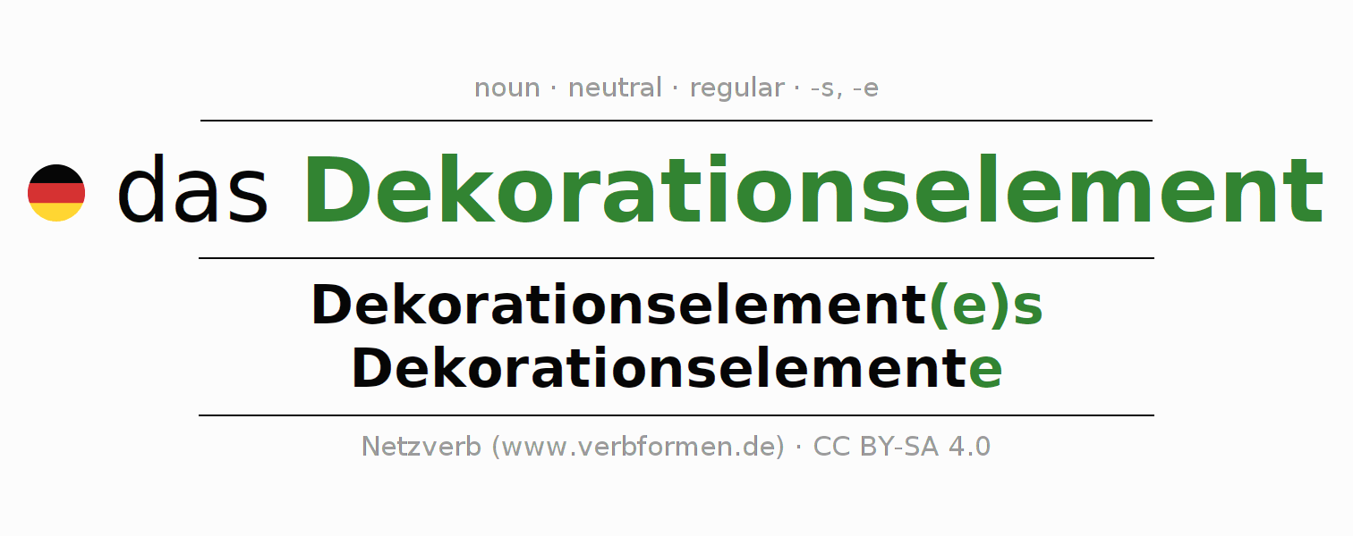 - Plural: die Dekorationselemente, der Dekorationselemente, den Dekorationselementen, die Dekorationselemente