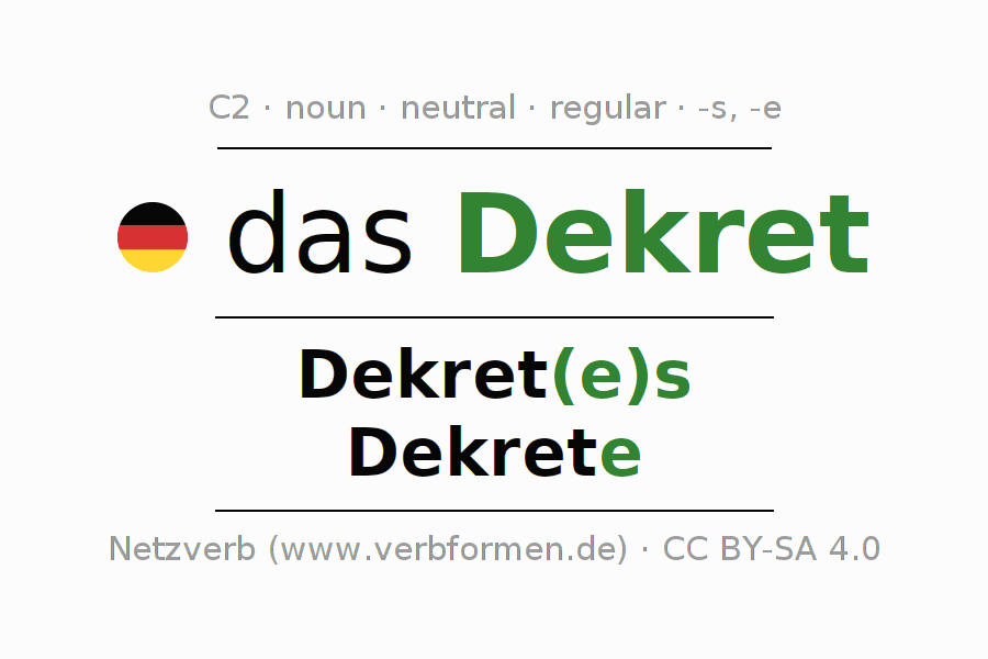 - Plural: die Dekrete, der Dekrete, den Dekreten, die Dekrete