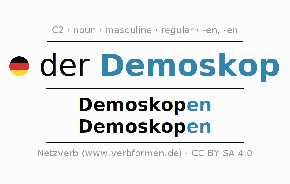 - Plural: die Demoskopen, der Demoskopen, den Demoskopen, die Demoskopen