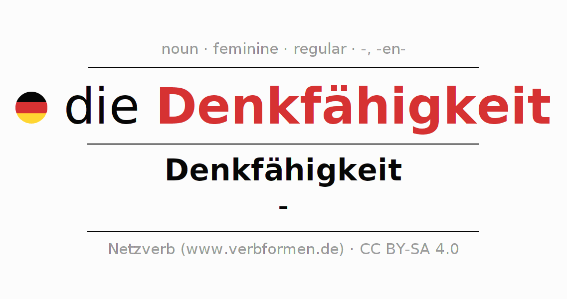 The declension of Denkfähigkeit as a table with all forms in singular (singular) and plural (plural) and in all four cases nominative (1st case), genitive (2nd case), dative (3rd case) and accusative (4th case). Especially for German learners the correct declension of the word Denkfähigkeit is crucial.