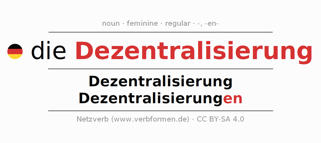 - Plural: die Dezentralisierungen, der Dezentralisierungen, den Dezentralisierungen, die Dezentralisierungen