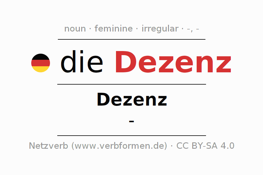 The declension of Dezenz as a table with all forms in singular (singular) and plural (plural) and in all four cases nominative (1st case), genitive (2nd case), dative (3rd case) and accusative (4th case). Especially for German learners the correct declension of the word Dezenz is crucial.