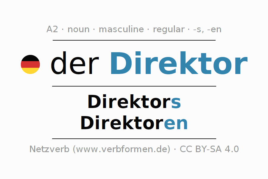 - Plural: die Direktoren, der Direktoren, den Direktoren, die Direktoren