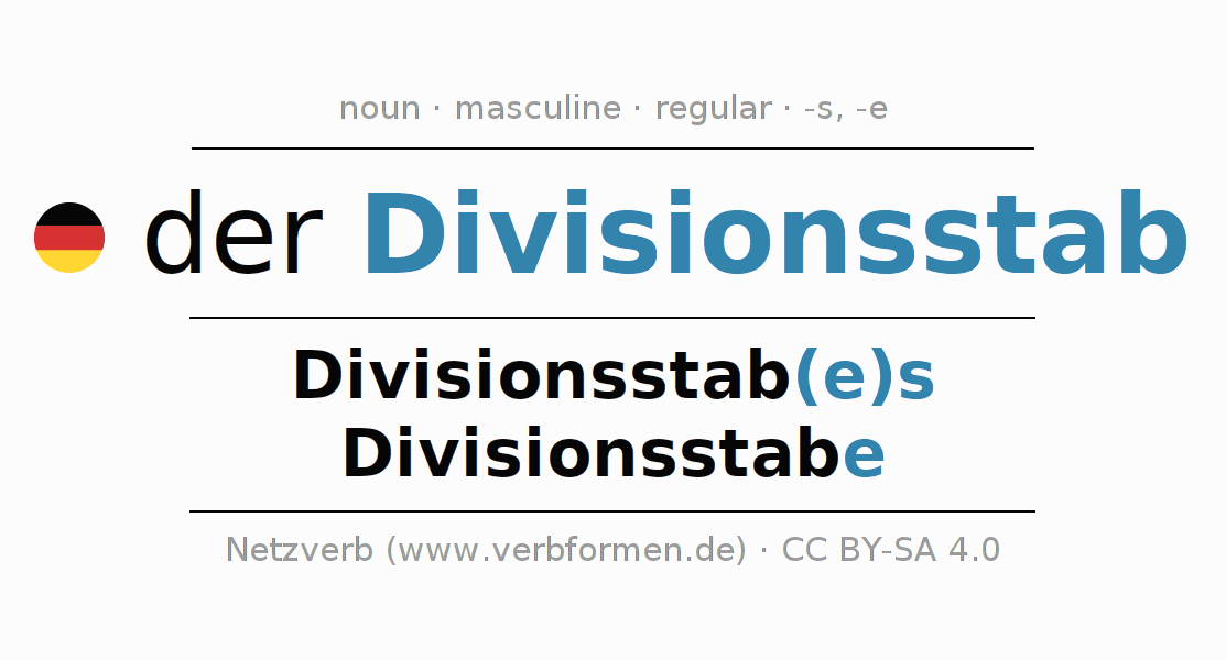 The declension of Divisionsstab as a table with all forms in singular (singular) and plural (plural) and in all four cases nominative (1st case), genitive (2nd case), dative (3rd case) and accusative (4th case). Especially for German learners the correct declension of the word Divisionsstab is crucial.