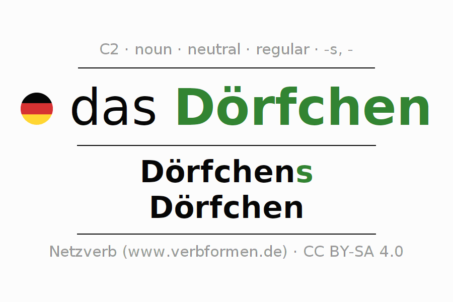 The declension of Dörfchen as a table with all forms in singular (singular) and plural (plural) and in all four cases nominative (1st case), genitive (2nd case), dative (3rd case) and accusative (4th case). Especially for German learners the correct declension of the word Dörfchen is crucial.