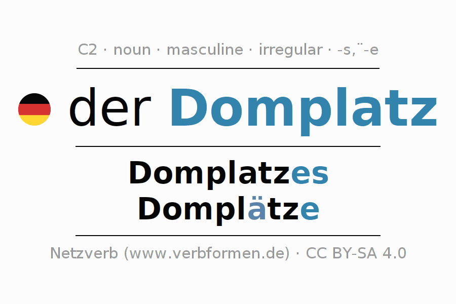 - Singular: der Domplatz, des Domplatzes, dem Domplatz(e), den Domplatz