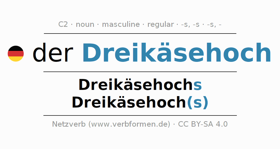 - Singular: der Dreikäsehoch, des Dreikäsehochs, dem Dreikäsehoch, den Dreikäsehoch