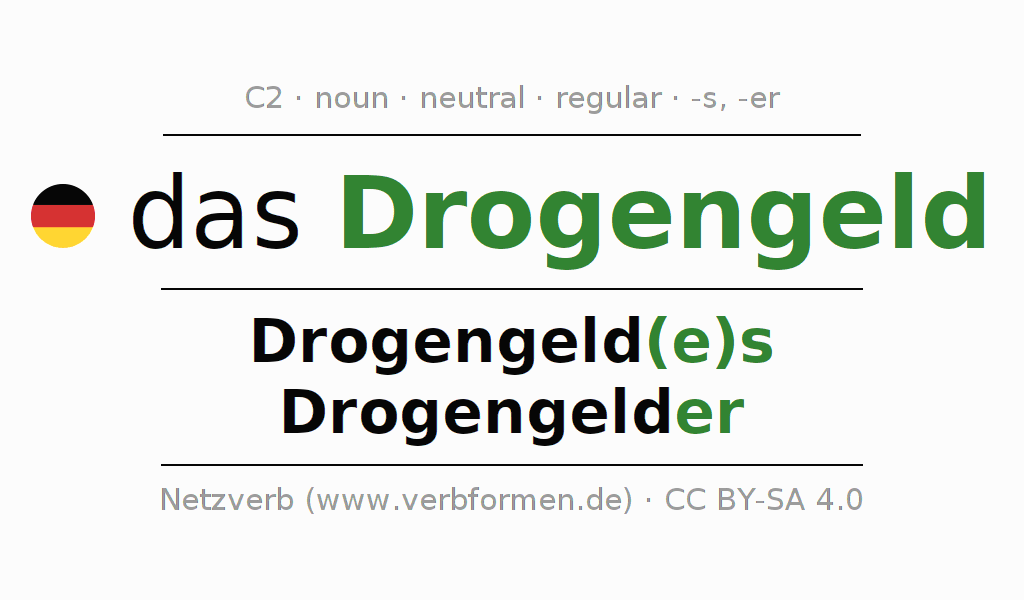 The declension of Drogengeld as a table with all forms in singular (singular) and plural (plural) and in all four cases nominative (1st case), genitive (2nd case), dative (3rd case) and accusative (4th case). Especially for German learners the correct declension of the word Drogengeld is crucial.
