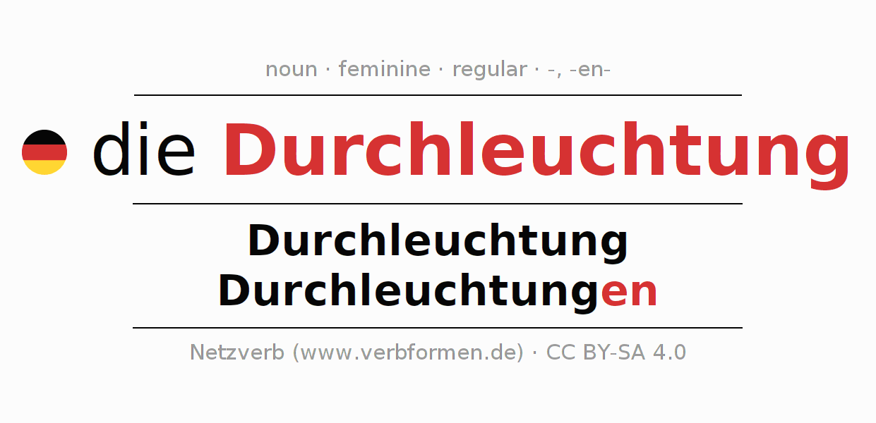 - Singular: die Durchleuchtung, der Durchleuchtung, der Durchleuchtung, die Durchleuchtung