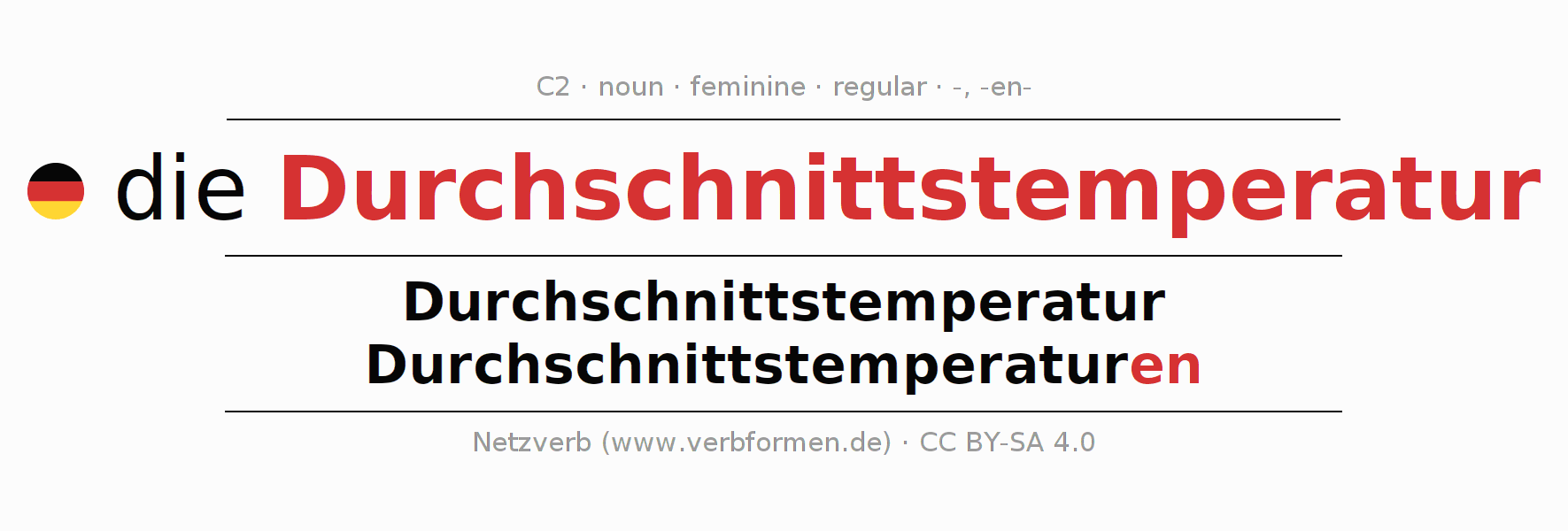 - Singular: die Durchschnittstemperatur, der Durchschnittstemperatur, der Durchschnittstemperatur, die Durchschnittstemperatur