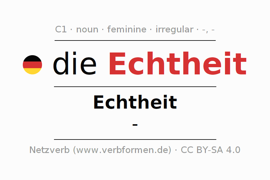 The declension of Echtheit as a table with all forms in singular (singular) and plural (plural) and in all four cases nominative (1st case), genitive (2nd case), dative (3rd case) and accusative (4th case). Especially for German learners the correct declension of the word Echtheit is crucial.