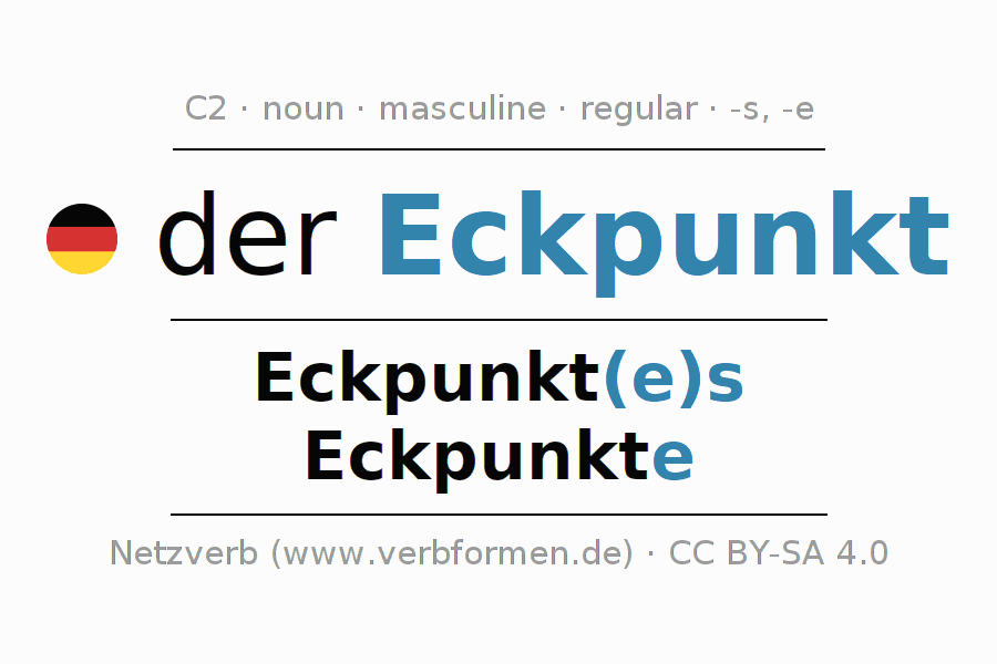 The declension of Eckpunkt as a table with all forms in singular (singular) and plural (plural) and in all four cases nominative (1st case), genitive (2nd case), dative (3rd case) and accusative (4th case). Especially for German learners the correct declension of the word Eckpunkt is crucial.