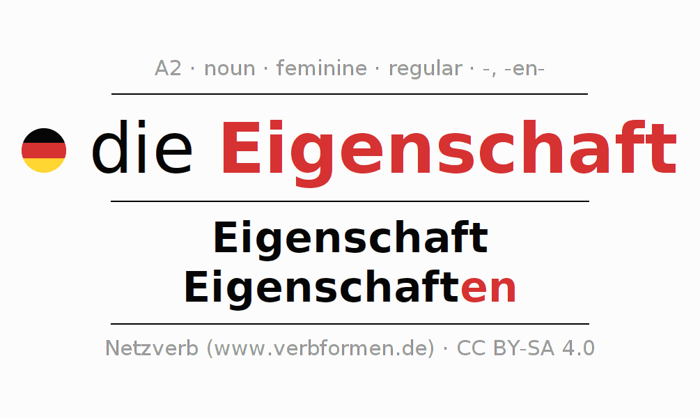 - Singular: die Eigenschaft, der Eigenschaft, der Eigenschaft, die Eigenschaft
