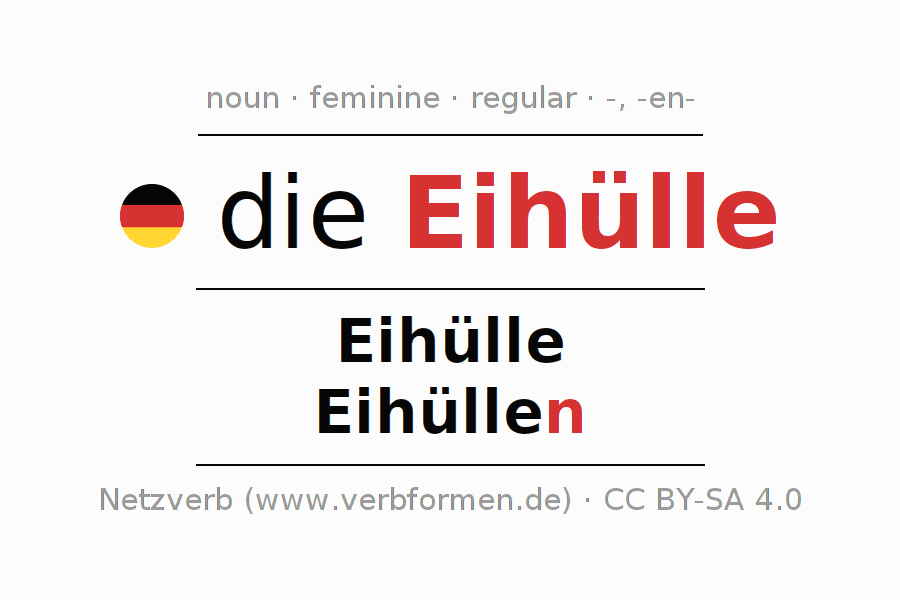 The declension of Eihülle as a table with all forms in singular (singular) and plural (plural) and in all four cases nominative (1st case), genitive (2nd case), dative (3rd case) and accusative (4th case). Especially for German learners the correct declension of the word Eihülle is crucial.