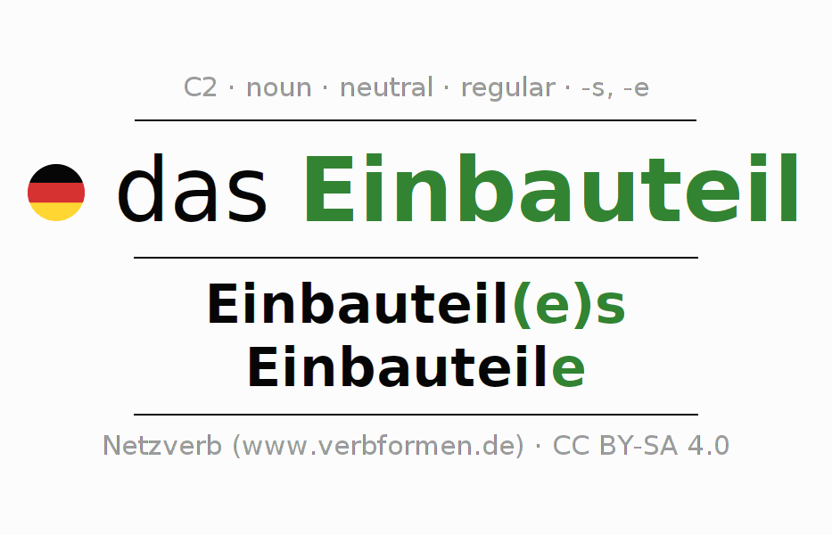 The declension of Einbauteil as a table with all forms in singular (singular) and plural (plural) and in all four cases nominative (1st case), genitive (2nd case), dative (3rd case) and accusative (4th case). Especially for German learners the correct declension of the word Einbauteil is crucial.