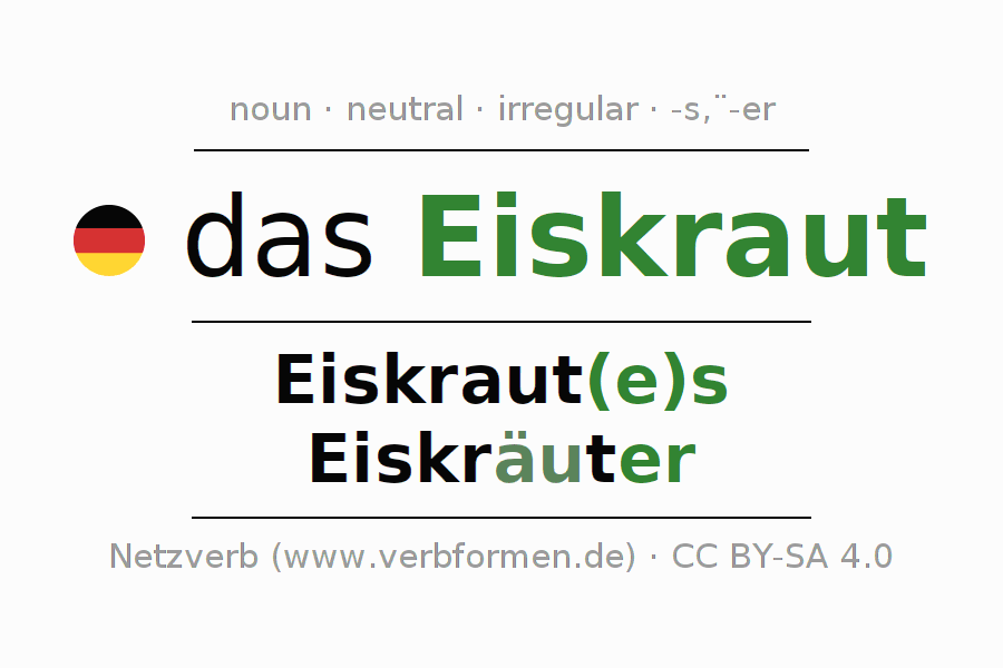 - Plural: die Eiskräuter, der Eiskräuter, den Eiskräutern, die Eiskräuter