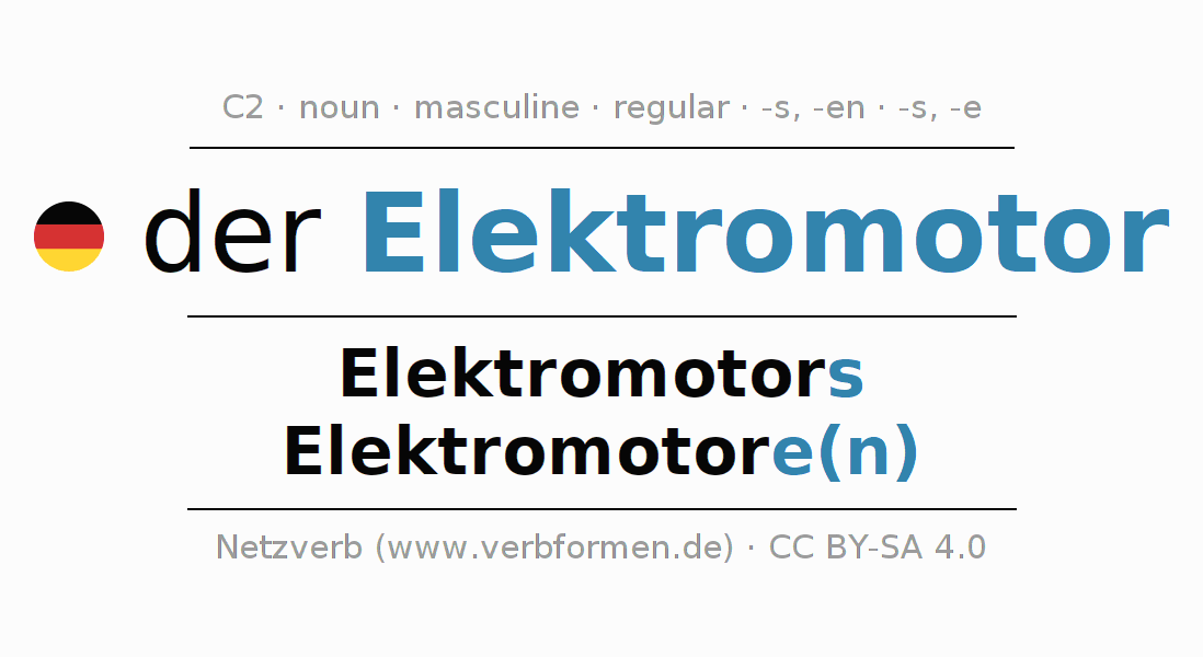- Singular: der Elektromotor, des Elektromotors, dem Elektromotor, den Elektromotor