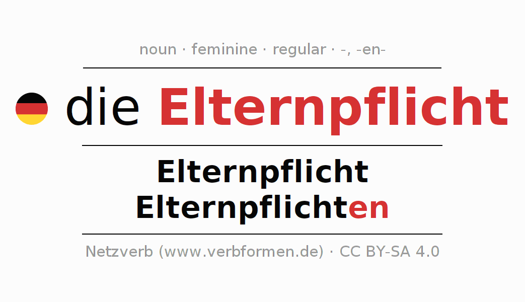 The declension of Elternpflicht as a table with all forms in singular (singular) and plural (plural) and in all four cases nominative (1st case), genitive (2nd case), dative (3rd case) and accusative (4th case). Especially for German learners the correct declension of the word Elternpflicht is crucial.