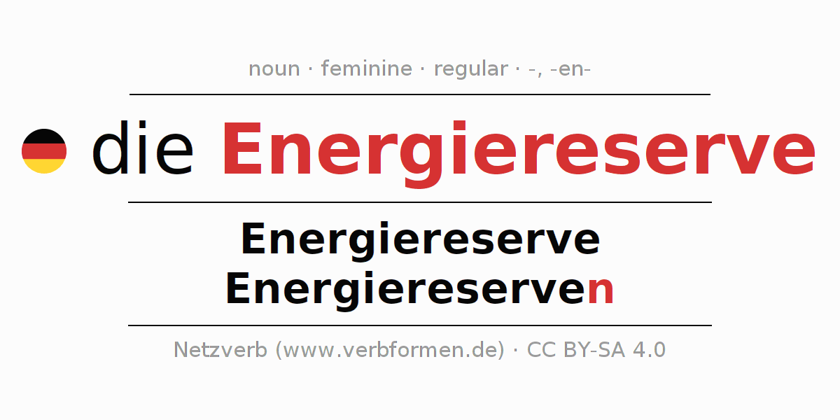 - Plural: die Energiereserven, der Energiereserven, den Energiereserven, die Energiereserven