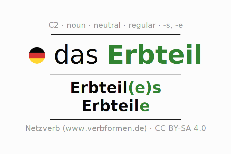The declension of Erbteil as a table with all forms in singular (singular) and plural (plural) and in all four cases nominative (1st case), genitive (2nd case), dative (3rd case) and accusative (4th case). Especially for German learners the correct declension of the word Erbteil is crucial.