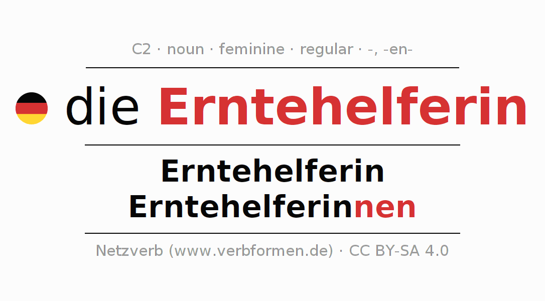 - Singular: die Erntehelferin, der Erntehelferin, der Erntehelferin, die Erntehelferin