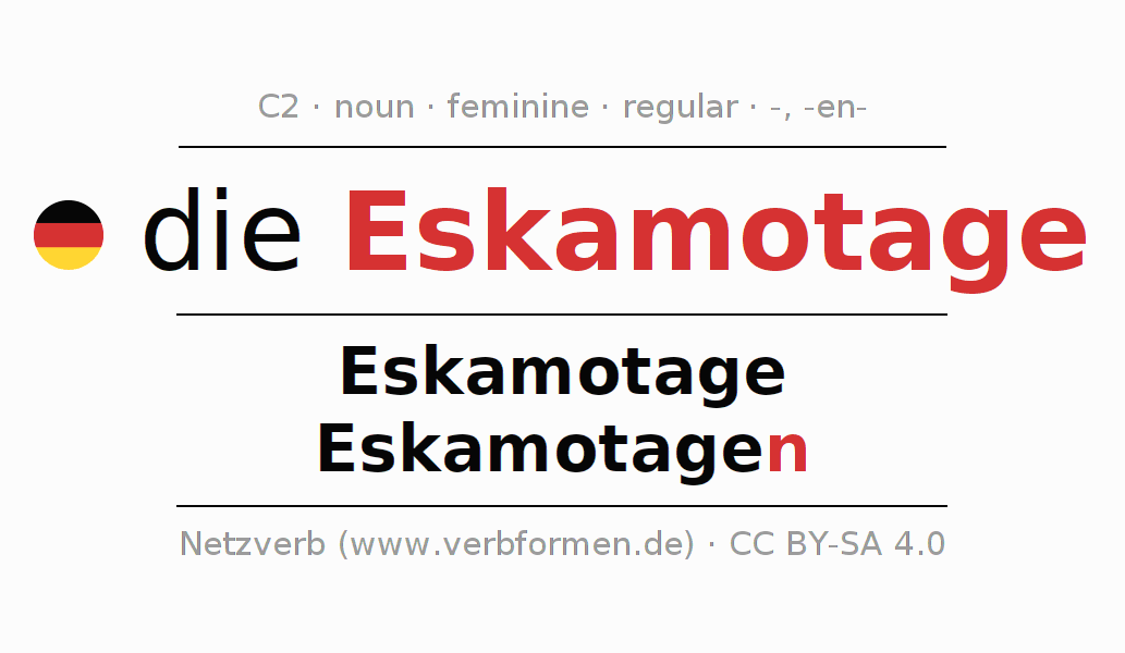 The declension of Eskamotage as a table with all forms in singular (singular) and plural (plural) and in all four cases nominative (1st case), genitive (2nd case), dative (3rd case) and accusative (4th case). Especially for German learners the correct declension of the word Eskamotage is crucial.