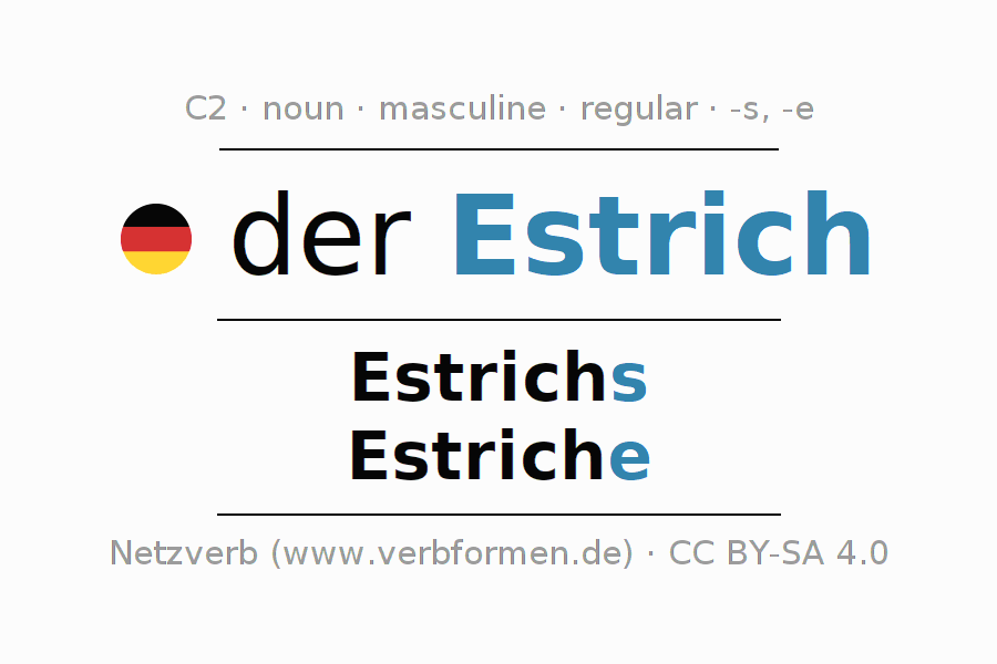 The declension of Estrich as a table with all forms in singular (singular) and plural (plural) and in all four cases nominative (1st case), genitive (2nd case), dative (3rd case) and accusative (4th case). Especially for German learners the correct declension of the word Estrich is crucial.