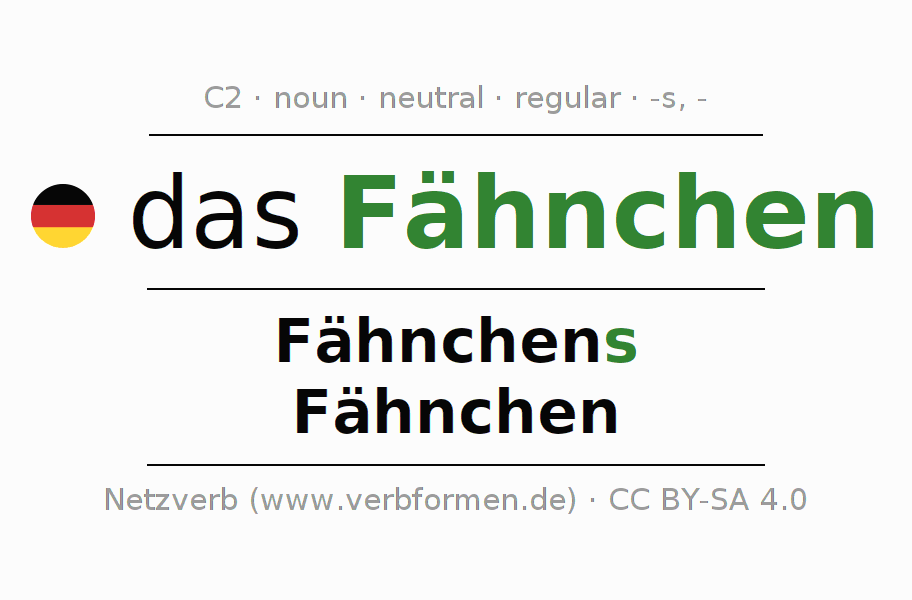 The declension of Fähnchen as a table with all forms in singular (singular) and plural (plural) and in all four cases nominative (1st case), genitive (2nd case), dative (3rd case) and accusative (4th case). Especially for German learners the correct declension of the word Fähnchen is crucial.