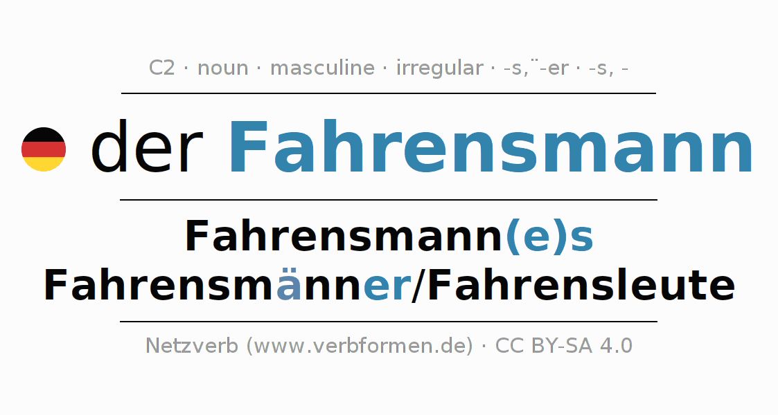 The declension of Fahrensmann as a table with all forms in singular (singular) and plural (plural) and in all four cases nominative (1st case), genitive (2nd case), dative (3rd case) and accusative (4th case). Especially for German learners the correct declension of the word Fahrensmann is crucial.