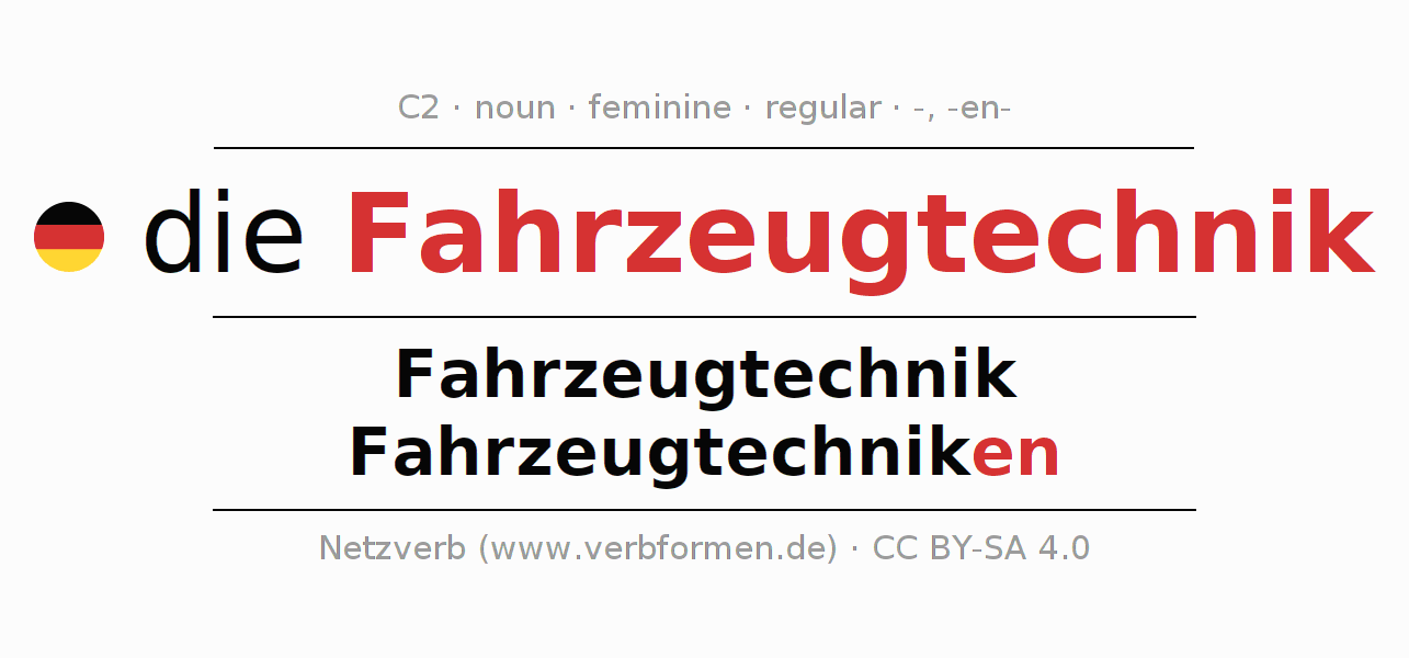 - Singular: die Fahrzeugtechnik, der Fahrzeugtechnik, der Fahrzeugtechnik, die Fahrzeugtechnik