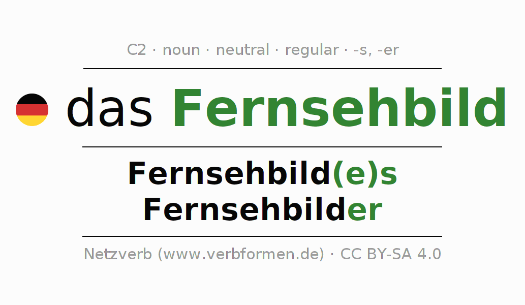 The declension of Fernsehbild as a table with all forms in singular (singular) and plural (plural) and in all four cases nominative (1st case), genitive (2nd case), dative (3rd case) and accusative (4th case). Especially for German learners the correct declension of the word Fernsehbild is crucial.