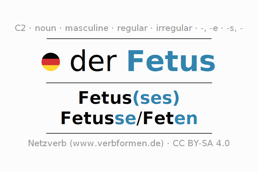 - Plural: die Fetusse/Feten, der Fetusse/Feten, den Fetussen/Feten, die Fetusse/Feten